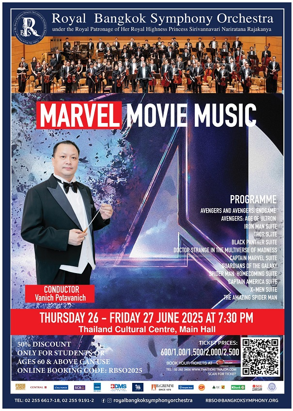 มูลนิธิรอยัลแบงค์คอกซิมโฟนีออร์เคสตร้า ในพระอุปถัมภ์สมเด็จพระเจ้าลูกเธอ เจ้าฟ้าสิริวัณณวรีนารีรัตนราชกัญญา จัดการแสดงคอนเสิร์ต Music from Marvel Studio ในวันพฤหัสบดีที่ 26 และวันศุกร์ที่ 27 มิถุนายน 2568 เวลา 19.30 น. ณ หอประชุมใหญ่ ศูนย์วัฒนธรรมแห่งประเทศไทย